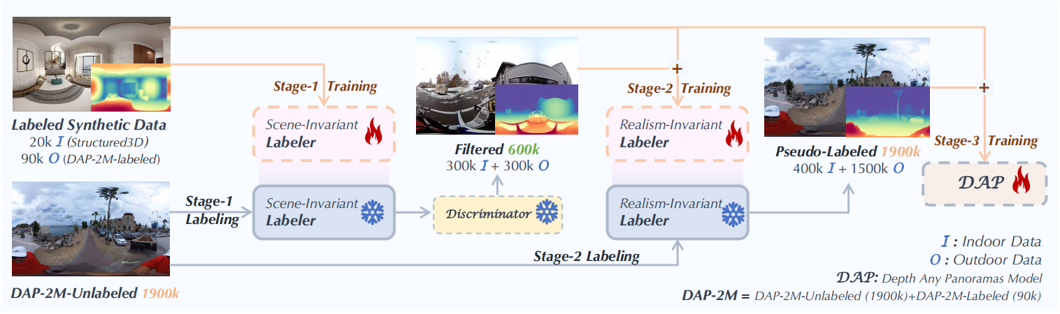 Stage 1 trains a Scene-Invariant Labeler on high-quality synthetic indoor and outdoor data