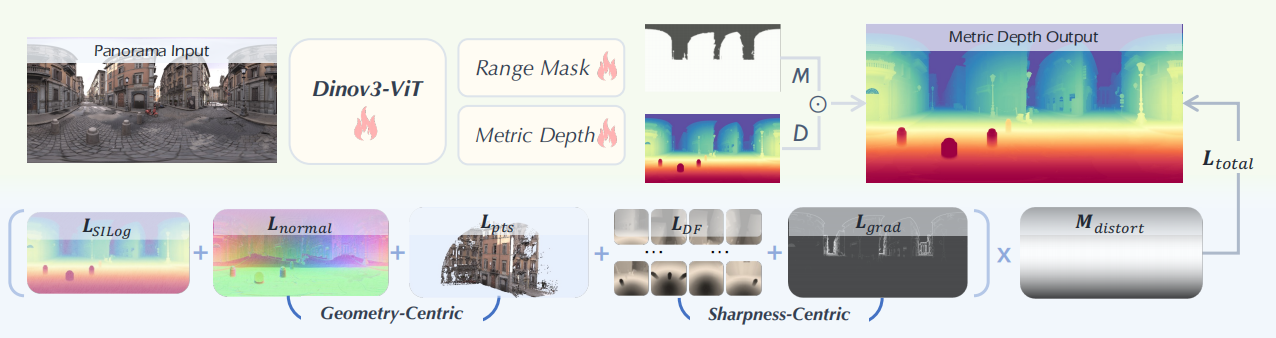 Built upon DINOv3-Large as the visual backbone, our model adopts a distortion-aware depth decoder
